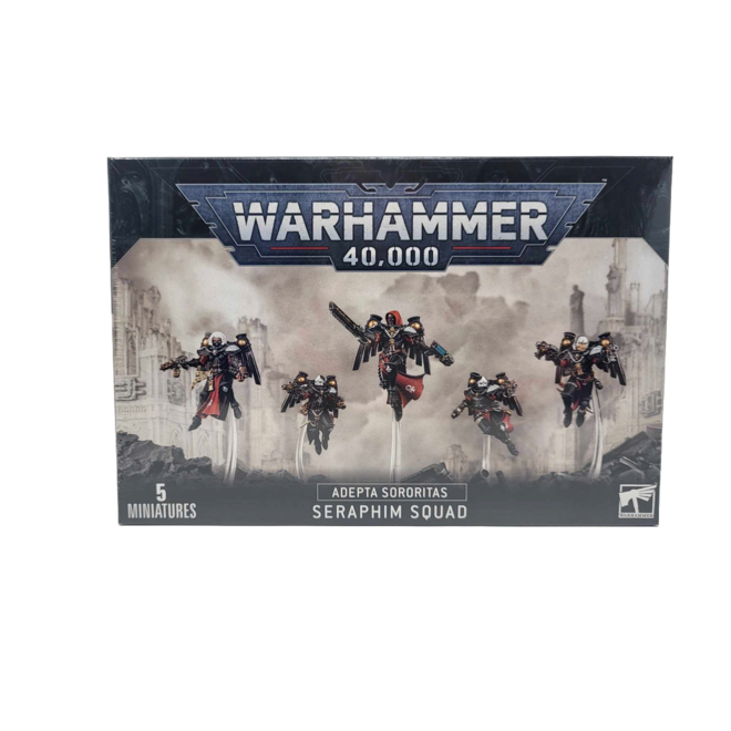 The kit builds five Seraphim. The Seraphim each carry two bolt pistols, though two of their number can instead be equipped with hand flamers while two more can bear inferno pistols. One model can be assembled as a Seraphim Superior, armed with a bolt pistol or plasma pistol in one hand and a choice of bolt pistol, chainsword or power sword in the other.