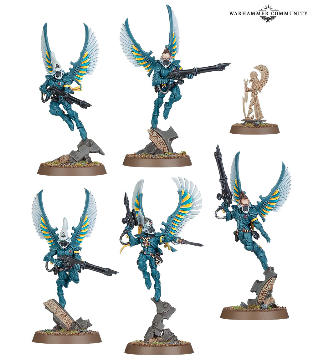 Soaring high above battle with speed and agility reminiscent of Faolchú the Great Falcon, Swooping Hawks are aerial daredevils who harry their foes with lasblaster salvoes and use back-mounted grenade packs to disperse infantry formations and critically damage vehicles alike. Much like their Phoenix Lord, the sight of them soaring through the air is a morale booster to ground forces. This new plastic kit contains optional helmetless heads, and a full complement of Exarch options, including a sunpistol and power sword, a Hawk’s Talon, an Exarch’s lasblaster and a scatter laser. It also comes with an Aspect Warrior shrine statue, and an Aeldari transfer sheet with 378 transfers.