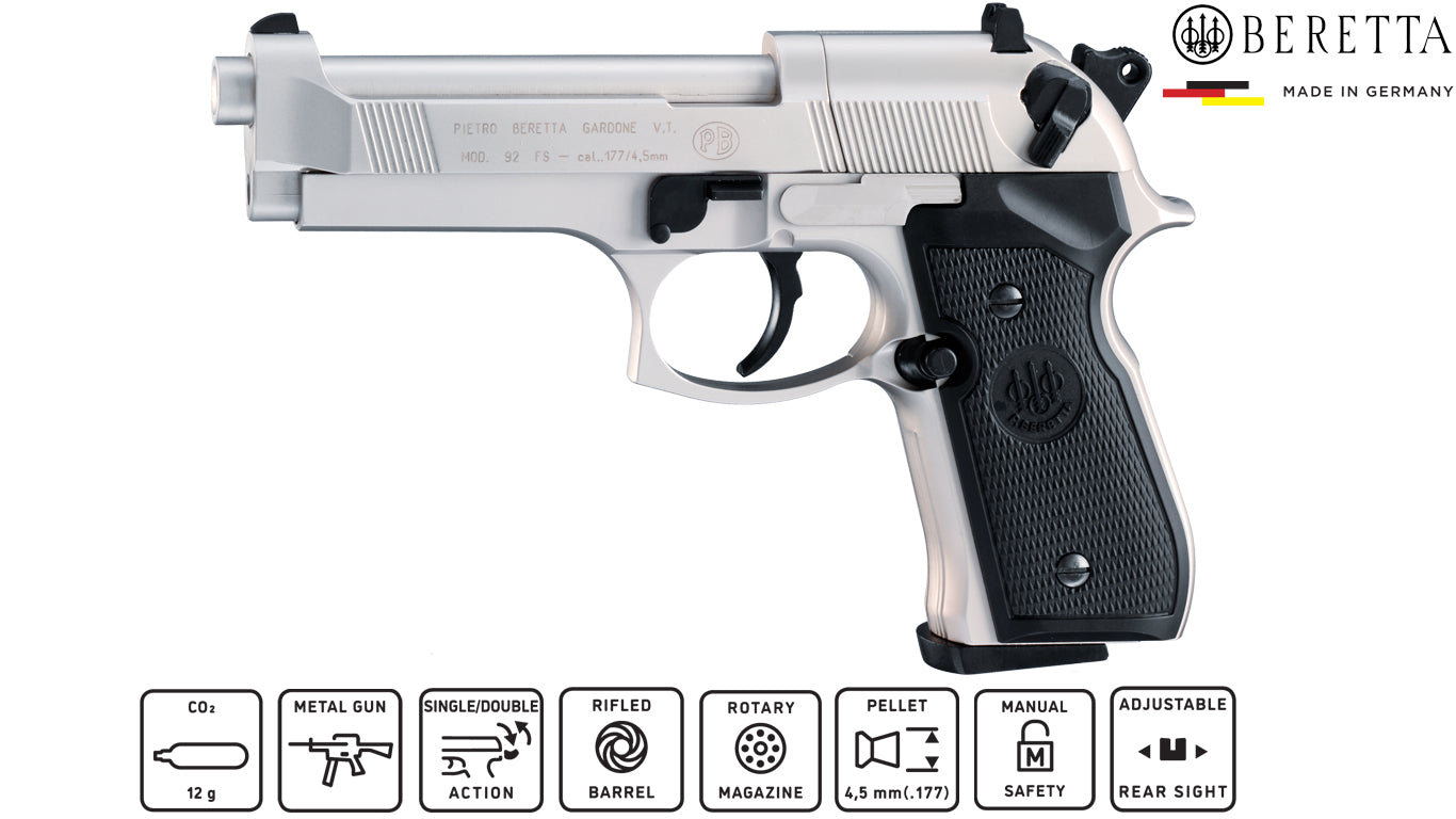 Used by military and police outfits around the world, the Beretta M92 FS is famed for its reliability and accuracy. Made by Umarex, the CO2 version of this world-famous pistol is no different.