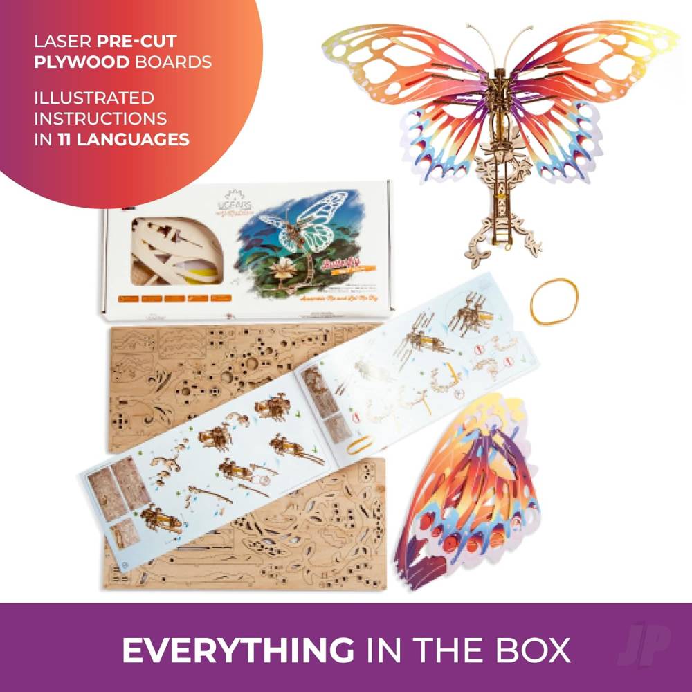 As with every model in the Ugears family, The Butterfly requires no glue or additional tools to assemble. You will build your new model out of ready-made details that come precisely pre-cut in high quality natural plywood boards. Slightly pushed, the details easily pop out of the board.