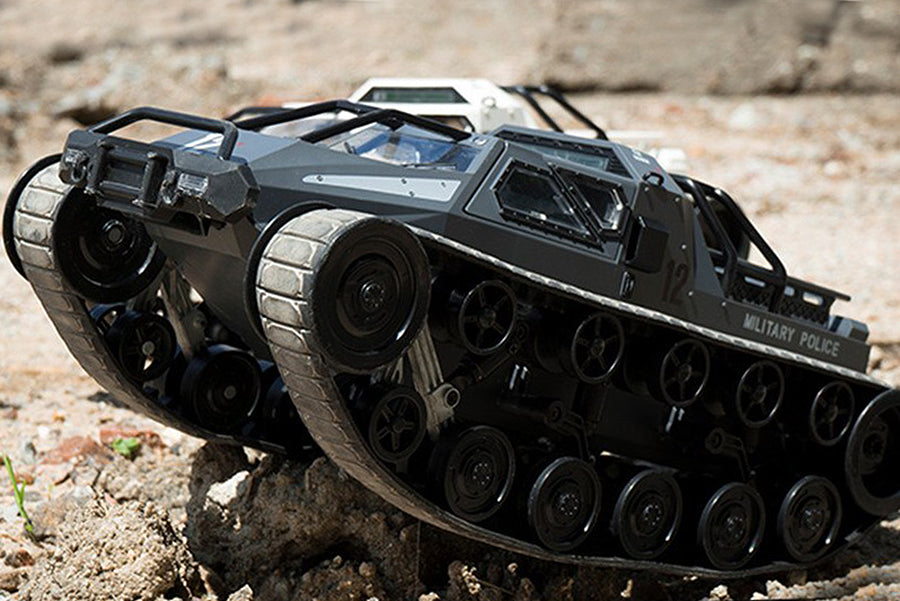 Tracks complete with shock absorbing independant suspension and a raised centre cockpit enables you to drive through shallow puddles (up to 5cm depth) and over obstacles with ease, as well as conquer gradients of up to 30°.