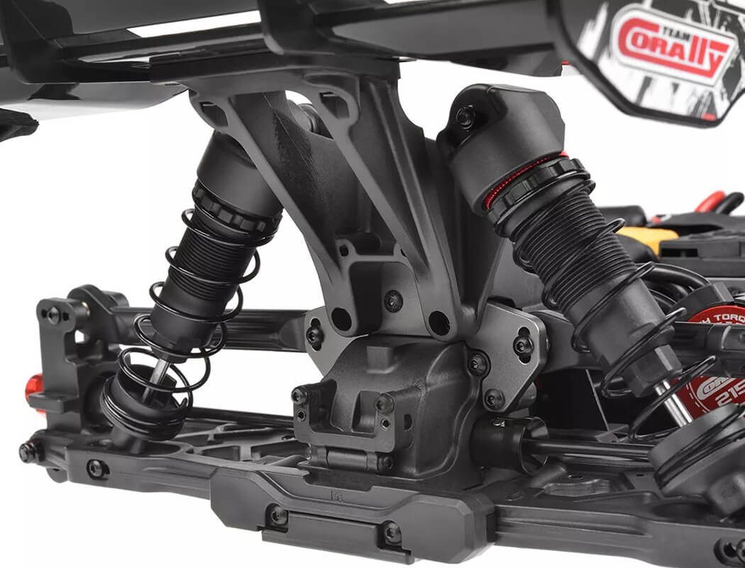 Every part of the Syncro is designed with durability and performance in mind. Its rugged suspension system, inspired by Team Corally’s high-performance 6S lineup, features heavy-duty suspension arms, reinforced steering blocks, and durable rear hubs. These components work together to handle jumps, bumps, and rough terrain with ease. The big bore composite shocks and sturdy shock towers keep the buggy stable, while the lightweight yet strong chassis ensures it’s ready to tackle any adventure. Add in features like a high-performance slipper clutch and steel drivetrain components, and the Syncro is as reliable as it is exciting to drive.