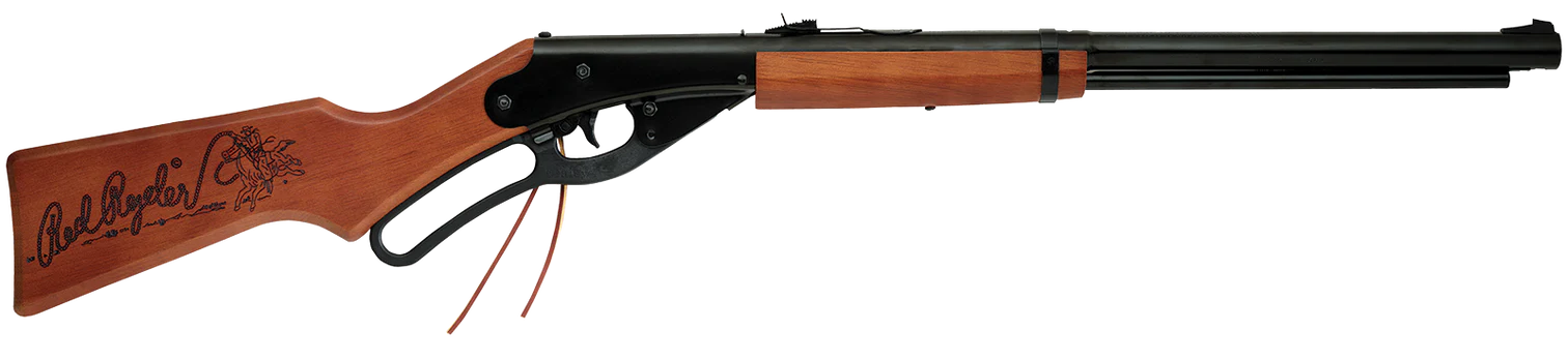 The Red Ryder spring-powered air rifle, with under-lever action and richly stained wooden stock, captures the spirit of the Old West. This rifle, which comes with front and rear iron sights and shoots 4.5mm BBs, is ideal for the younger shooter, and great for target shooting and general garden plinking.