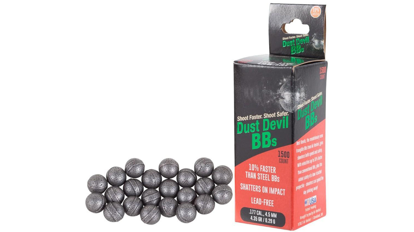 Dust Devil BBs are the world's first frangible BBs in .177 / 4.5 mm BB. They shatter on hard surfaces on impact, minimizing the risk of ricochets for which steel BBs are known. Dust Devils are lighter and faster than steel BBs, lead free and usable in magnet-operated magazines.