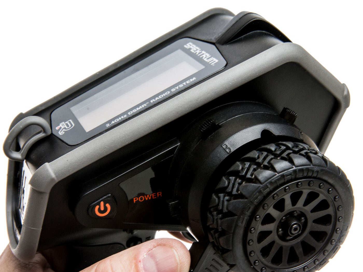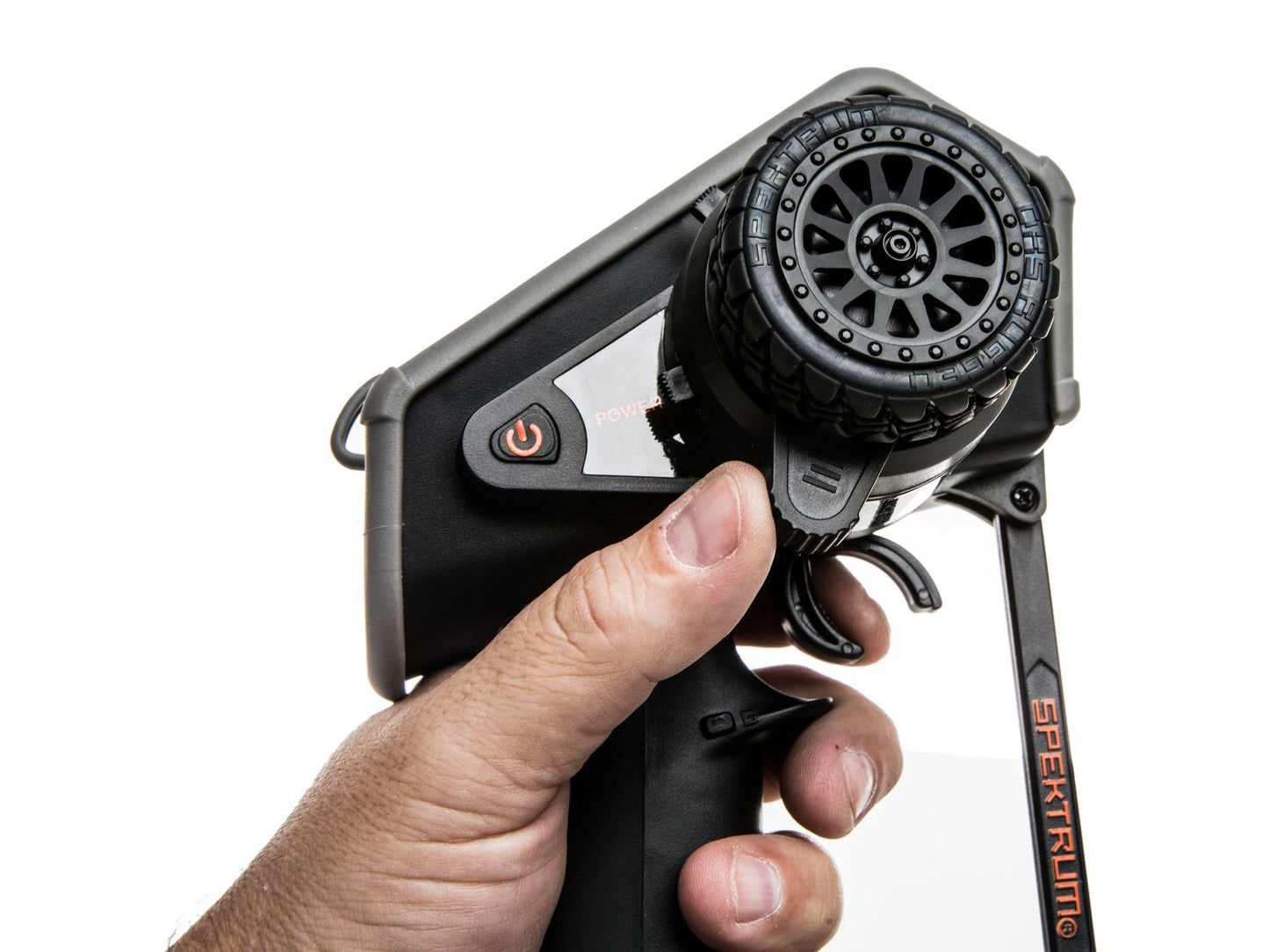 The aggressive off-road steering wheel tread helps the precision of Spektrum technology to also deliver a tactile feel even if you're crawling, bashing or boating in harsh conditions. The integrated thumb-lever innovatively makes it possible to steer one-handed safely and with a higher-level of precision.