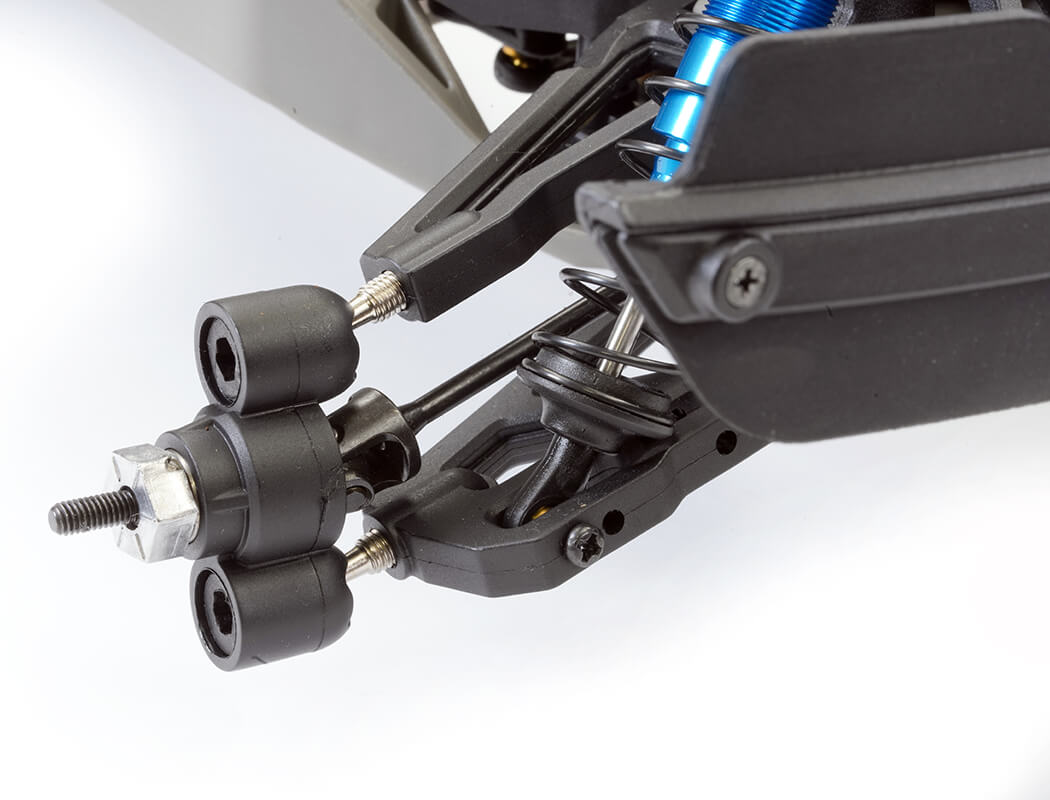 Pivot ball suspension with adjustable turnbuckles, provides tunabilty should you wish and front CVA driveshafts and metal geared differentials front and rear provide reliable service.