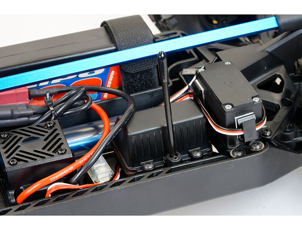 A ballraced, sealed drivetrain with slipper unit along with metal diff gears with front universal driveshafts are ready to take care of the power when you hit the gas. New, sturdy front and rear towers with a full-length brace bar provide extra rigidity, while the heavy-duty rear spoiler maintains traction and stability at speed. Topping things off is the Crossbow’s aggressively styled, low slung bodyshell complete with roof light bar, roof skid rails and mounting point reinforcement plates.