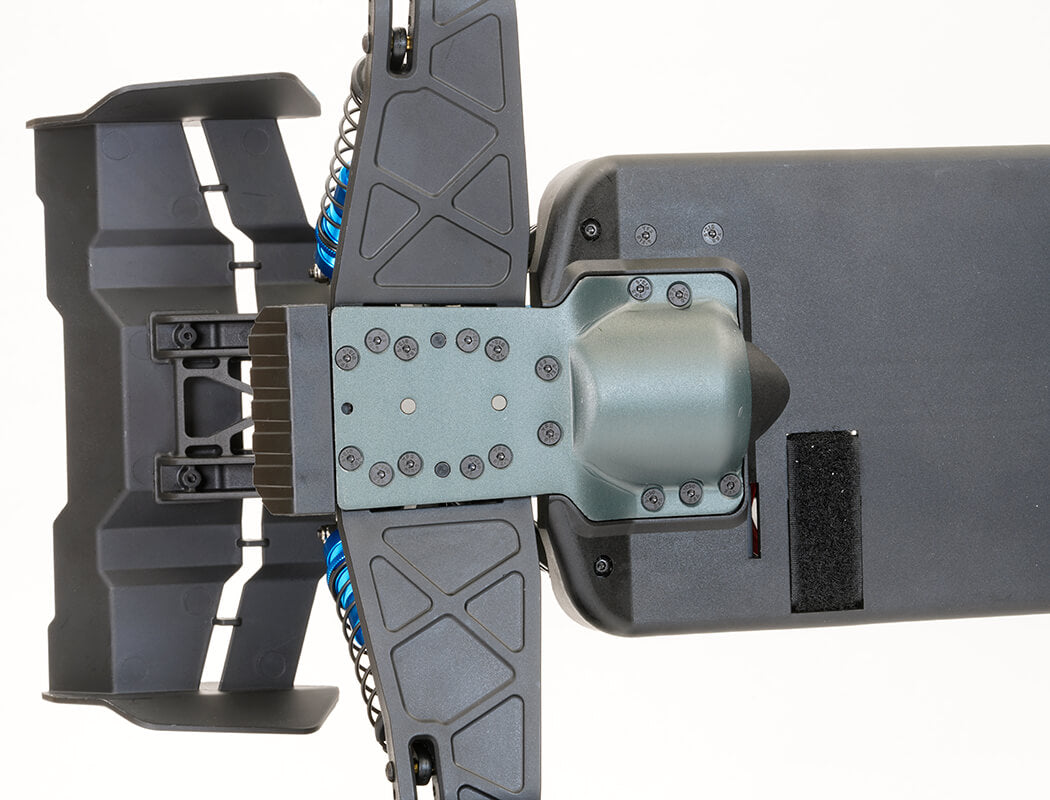 Long throw, double wishbone suspension with pivot ball front set-up, feature reinforced lower arms for less flex, while aluminium adjustable, oil filled big bore shock absorbers, finished in stylish blue are ready for what awaits on each corner.