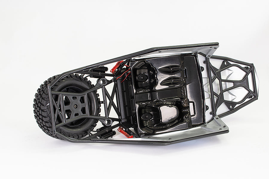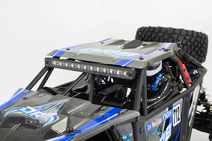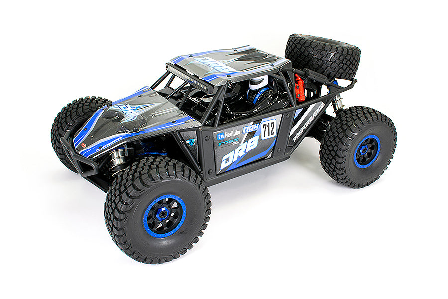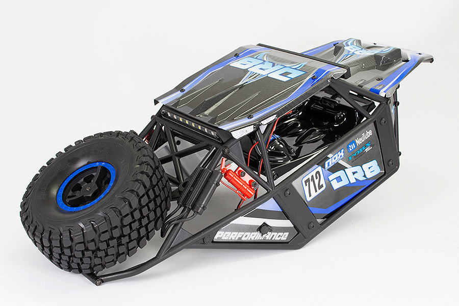 The DR8 is topped off with a classic, desert buggy inspired moulded tubular roll cage frame with printed lexan panels and spare wheel. A detailed interior driver cockpit, painted fire extinguishers are all rounded off with super bright front and rear LED light bars.