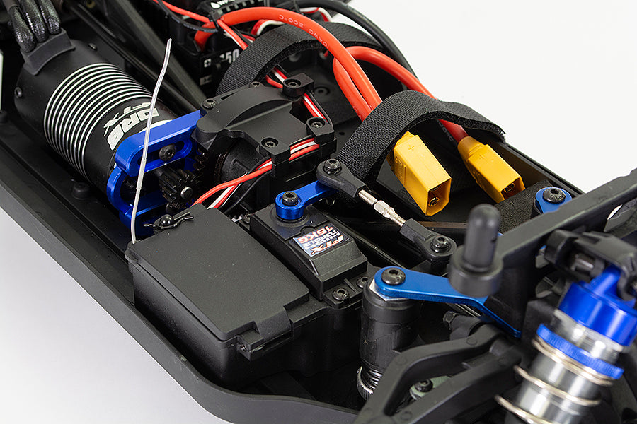 At these speeds a solid base is required and the DR8 features heavy-duty materials and a proven design, with 3mm heavy-duty aluminium front and rear braced main chassis, 5mm thick front and rear aluminium shock towers and reinforced moulded suspension components all standard to help soak up any high speed tumbles.