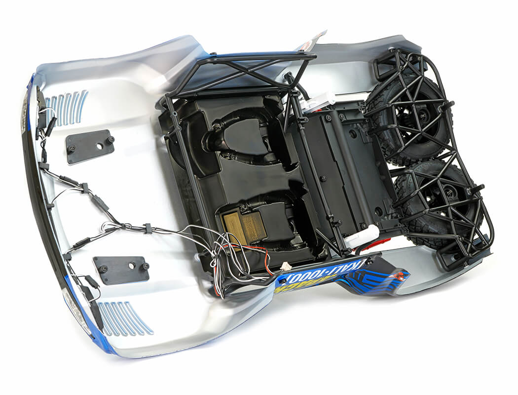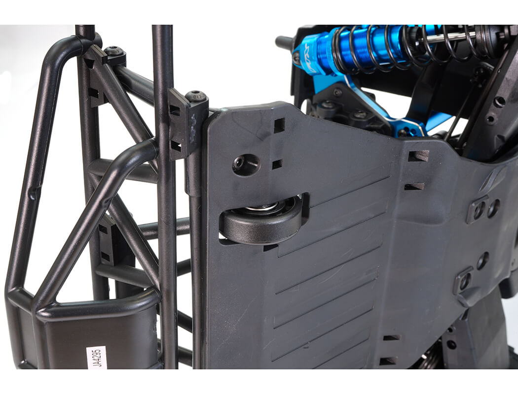 Internal wheel well fenders and side guards protect the chassis from debris, whilst front and rear super-duty bumpers and skid plates protect the chassis from impacts and heavy landings. Furthermore, if you are a little trigger happy, inset wheelie wheels in the rear skid plate assembly will help you keep control.