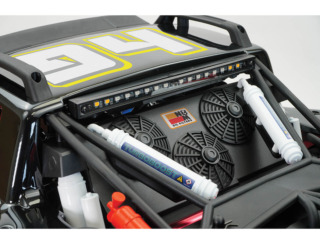 Inspired by desert trophy trucks, the Grand Apache features numerous semi-scale features and details. Factory fitted LED front headlights and grill LED light bar, along with a roll cage mounted light bar help illuminate the way, whilst a rear light bar kicks in under braking. If you suffer a flat or blow out then two full function spare tyres mount to a sturdy rear roll cage assembly that also displays fire extinguishers, shock reservoirs, and engine cooling fans. Inside a detailed cockpit with driver, navigator and dashboard.