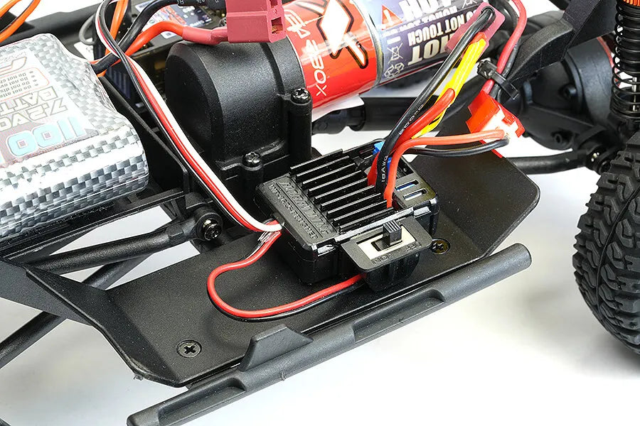 The waterproof Hobbywing 25Amp speed control coupled with the reduction gearbox provides perfect slow control and torque for you to creep your way through the trails.