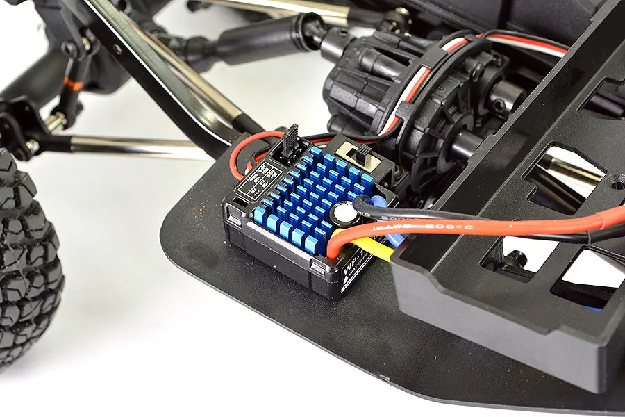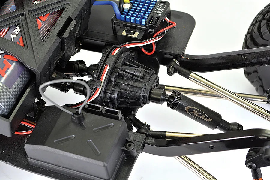 Aluminium CNC shock absorbers are standard front and rear as are dual rated front springs. With the battery pack mounted further forward and the motor and Etronix 15kg servo set directly over the axle, weight bias and climbing ability is greatly improved.