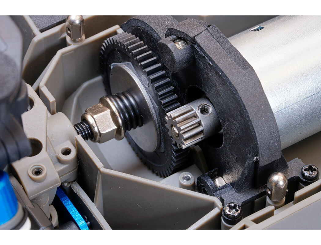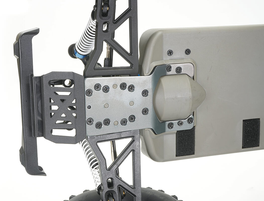 The 4WD shaft system transmission features a slipper unit to protect the driveline as well as metal geared front and rear differentials. Oil filled shock absorbers along with a raised high clearance main chassis, with aluminium front and rear skid plates glide over most terrain effortlessly. Should you take a tumble, shock absorbing bumpers and moulded body roof and tail skid bar rails help protect from heavy damage whenever possible.