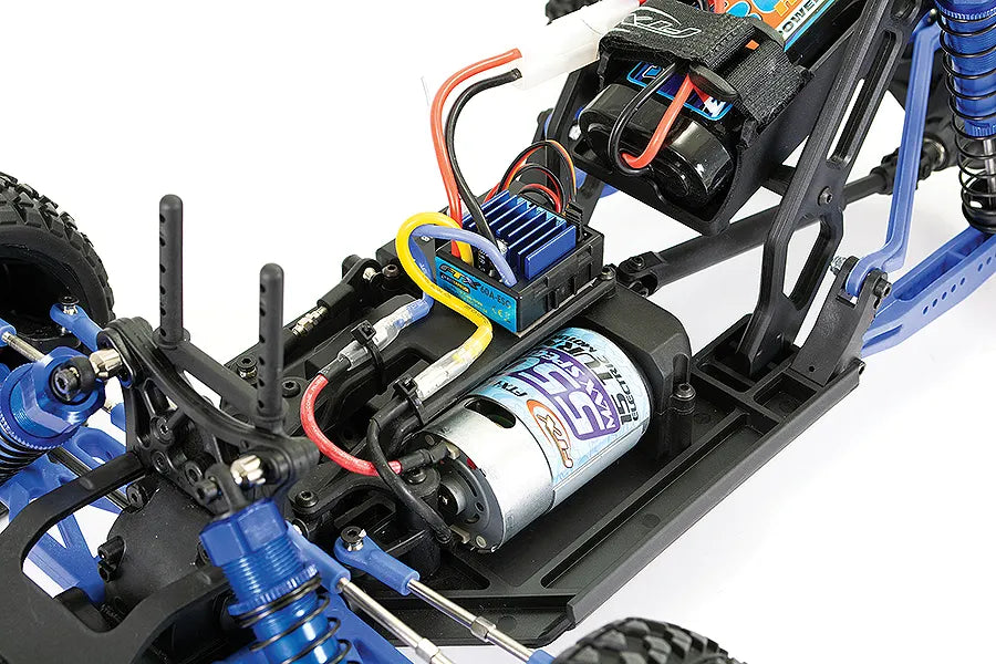 This full featured brushed truck is a perfect entry in to 1/10th scale r/c and represents great value with a 60A speed control, Etronix radio sys-tem and Voltz 1800mAh battery pack. Not to mention the blue anodised aluminium shock absorbers front and rear, metal differential and crown gears and sealed 4wd shaft drive tranmission.