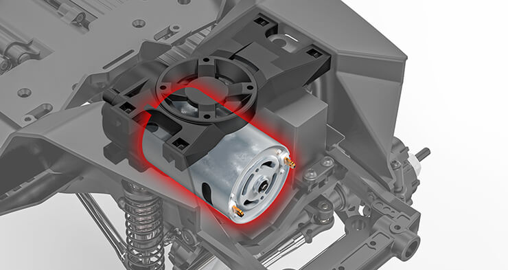 Front mounted motor helps the vehicle’s weight balance to the front. Either a 540 or 550 size motor can be mounted and a cooling fan will be easily fitted to the incorporated structure.