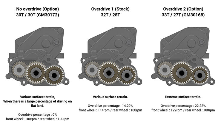 Overdrive system means the front and the rear wheels rotate for different speeds. The GS02F transmission is designed to rotate the front wheels faster than the rear wheels.