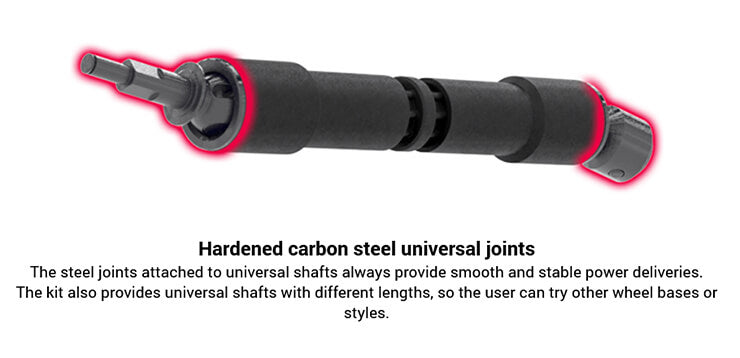 The steel joints attached to universal shafts always provide smooth and stable power deliveries. The kit also provides universal shafts with different lengths, so the user can try other wheel bases or styles.