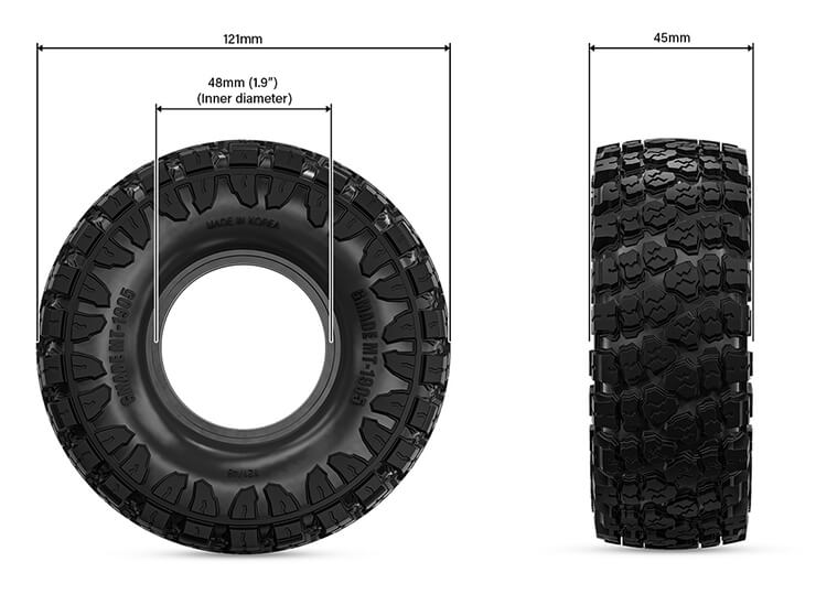 The MT 1905 off-road tires, made of super soft compound material provide much traction to the surfaces. The tread patterns are suitable for off-road driving and the large diameter of the tires enables it to run smoothly on any uneven road surfaces.