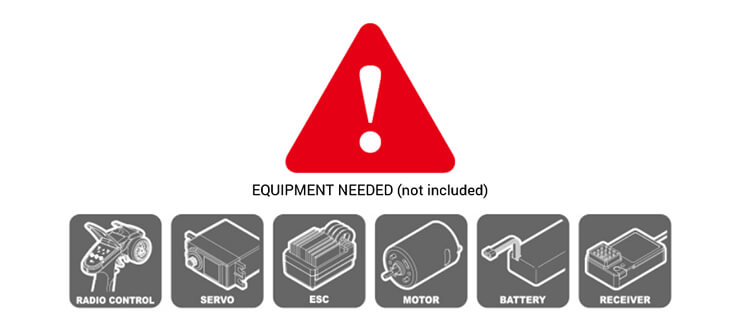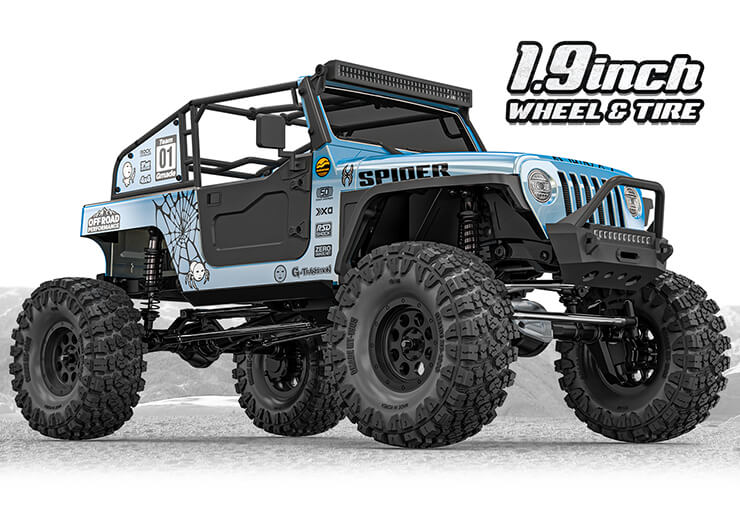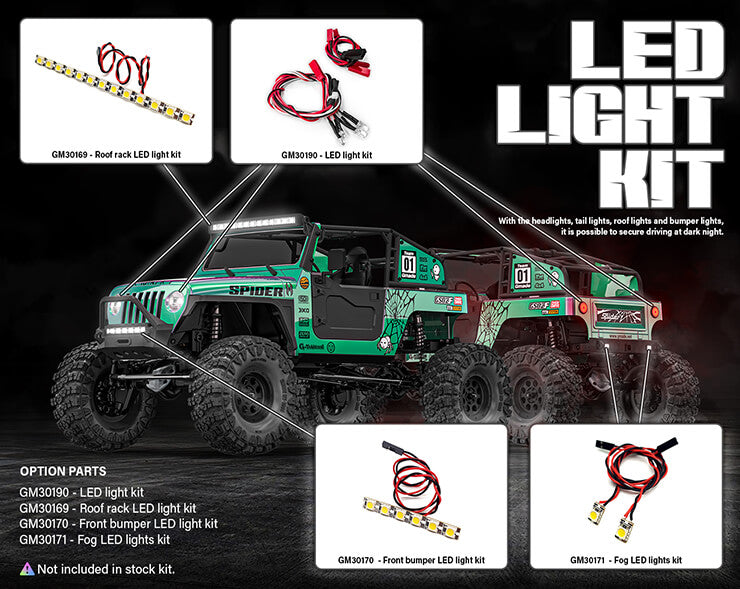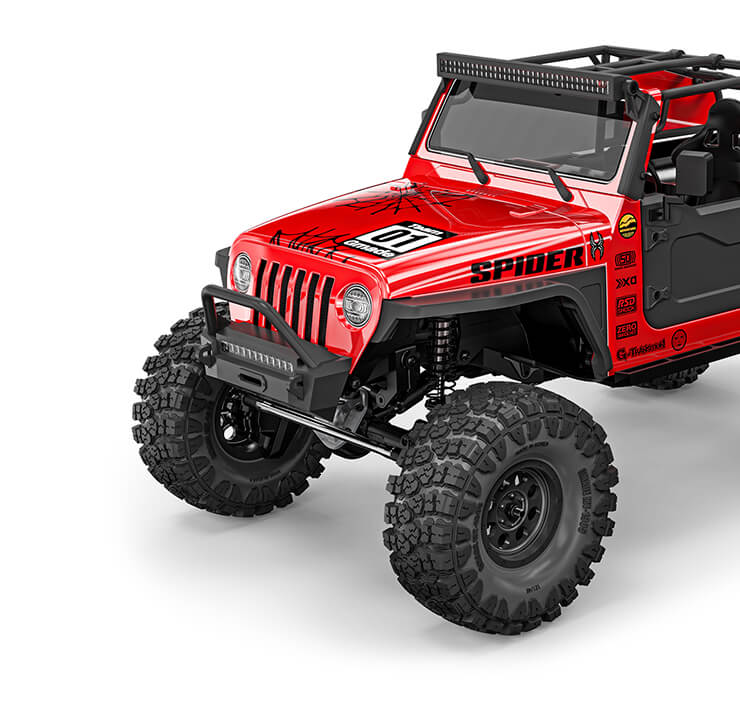 The spider body is a NO TOP style body made of high quality 1.5mm lexan with high strength and details. To add realism details it includes front grille, light bucket, side mirrors, wipers, driver seat, steering wheel, shifter, overfenders, roll cage and a LED light bar so you can tune into a realistic off-road vehicle to matches the concept of off-road adventure. The accessory parts are made of high-strength plastic so they are resistant from the highly impacts, and include decals with realistic details.