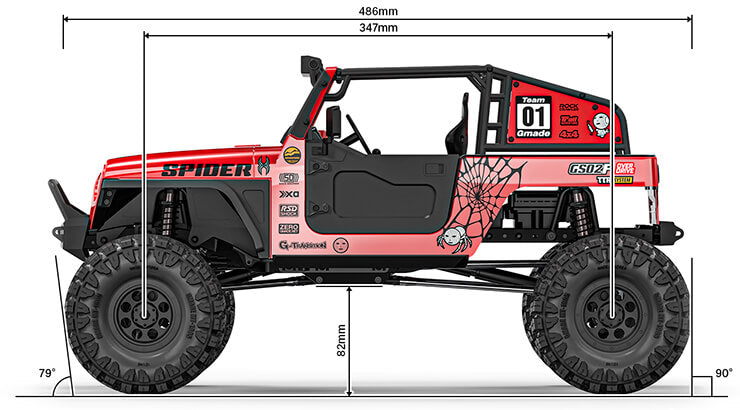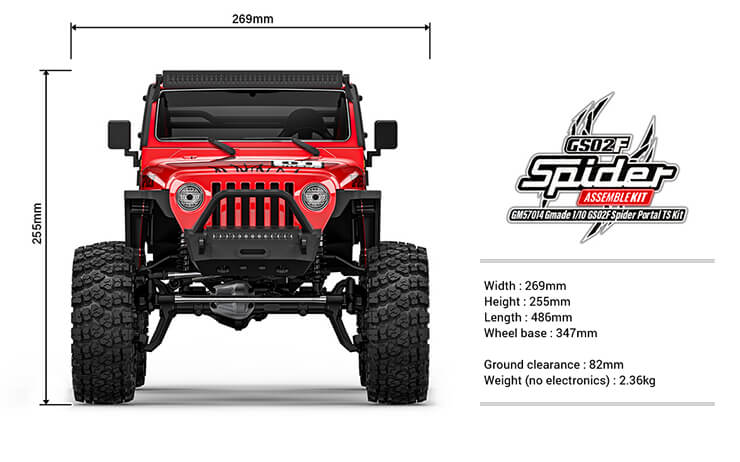 Weight balance of the GS02F chassis is leaning forward. This increases traction of the front wheels and provides better crawling performance at high angle hills or rocks. It also minimizes rolling over backwards when climbing.