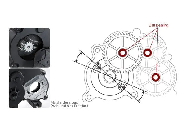 The perfectly sealed R1 transmission is dust proof. Full ball bearings are placed at all axis of the gears. You can also adjust the gear mesh backlash exactly the way you want because the motor mount cap can be opened and closed for you to see in.