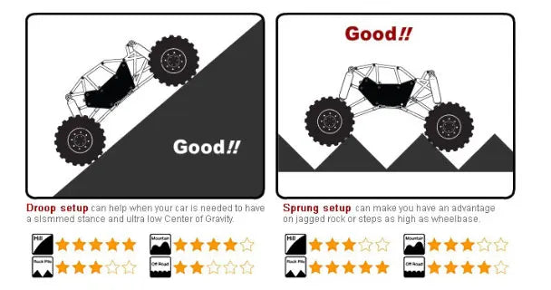 The G-Transition shock settings can be changed to suit your driving style, courses and terrain, these can be setup to run in Droop or Sprung suspension setup. This can greatly upgrade your driving performance. You can set up to run in Droop or Sprung suspension setup