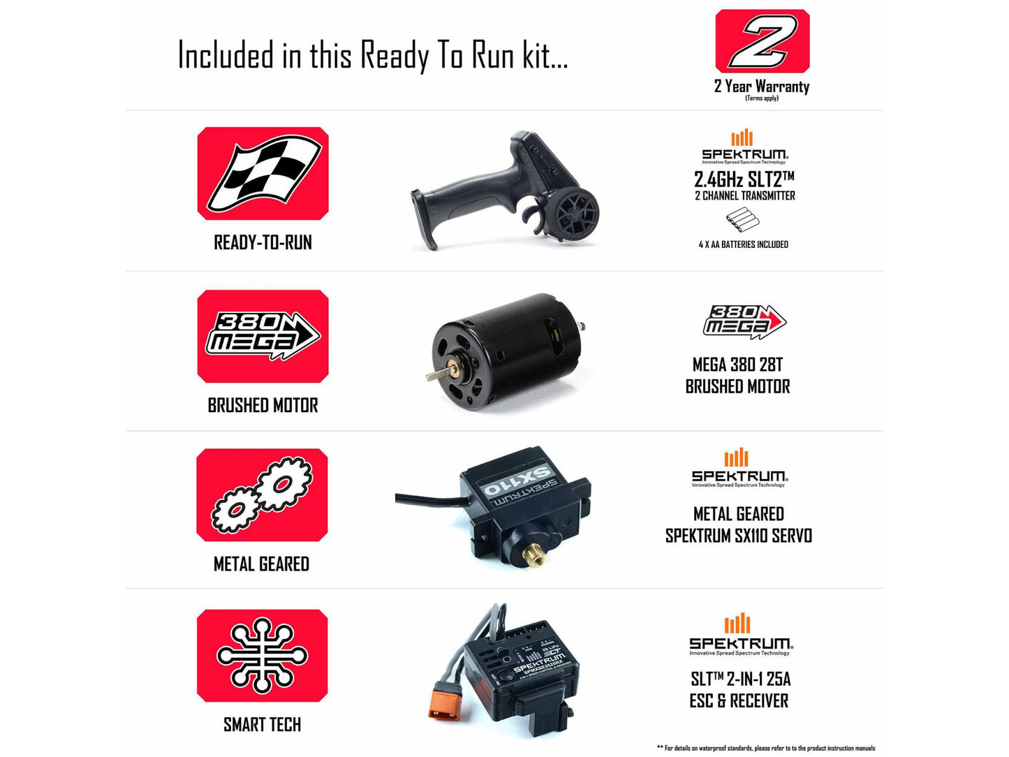 The ARRMA GRANITE GROM 4X4 Monster Truck endures any punishment you can dish out. Impact-absorbing front and rear bumpers are the bash-ready bookends to its strong composite chassis. A 4WD transmission with robust metal gears carries power from the MEGA 380 brushed motor through an enclosed drivetrain to the tough dBoots® FORTRESS™ monster truck wheels and tyres. Even the Spektrum™ SX110 steering servo has metal gears — and, like the IC2® connector-equipped Spektrum SLT™ 2-in-1 25A ESC and receiver, it's waterproof for carefree bashing in any conditions.