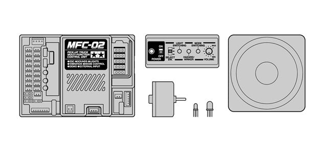 Built to easily fit into Tamiya 1/10 electric RC pickup trucks such as the Ford F-350 High Lift, Toyota Hilux etc., Tamiya adds authentic feeling by linking the real sound, the functions of various lights, and body vibration together. The engine sound can be selected from two types of large displacement V8 and small displacement turbo engines: engine start sound, idling sound, throttle operation. In addition, the engines sound will change when actually changing as you shift through the gears. Furthermore, the body vibration changes according to the engine rotation number which gives the model a sense of weight. This unit can also be used for various lighting control.