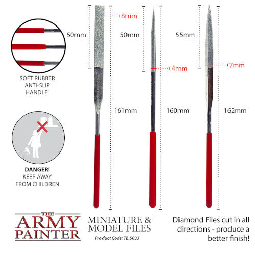 These 3x diamond files are extremely versatile tools for the wargamer & hobbyist. A must-have for custom conversions and cleaning mould lines, as well as preparing pieces for gluing. Works on plastic, resin, and metal surfaces.