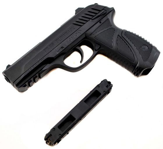The Gamo PT-85 CO2 pistol uses a 12g CO2 cartridge, which mounts directly into the pistol's grip, and a 8-round double rotary magazine (16 rounds in total) for a well-rounded performance, whatever your preferred shooting activity.