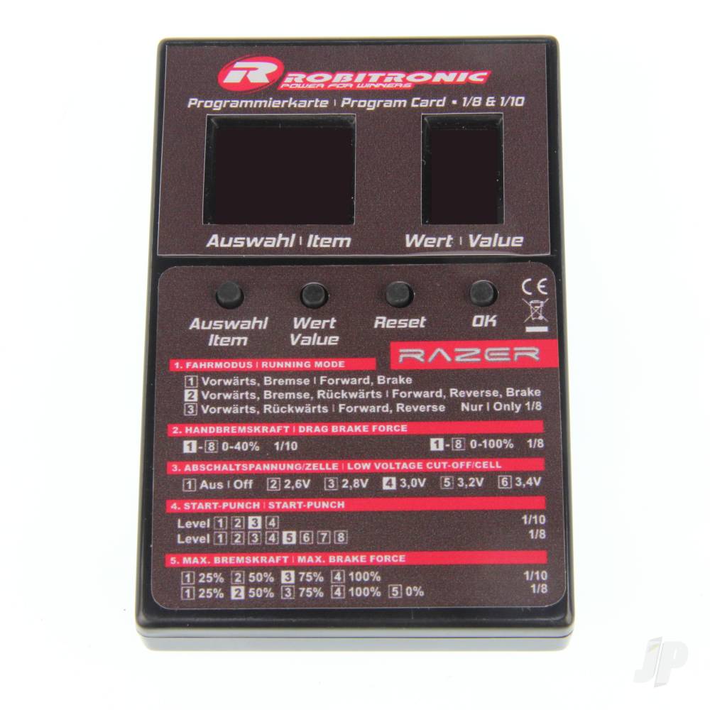 This LED program box is for programming Robitronic Razer ten & eight ESCs. Its friendly interface makes ESC programming easy and quick. It's compact, portable and very applicable for field use.