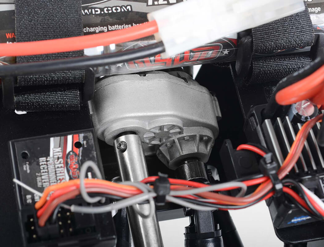 The C2X features the classic styling of the 4 Door Mojave body mated with the Marlin style grille and machined delrin bed. Underneath, the chassis is 3mm thick CNC aluminum offering multiple mounting positions for the suspension links and rear shocks. Slide over obstacles with ease thanks to the machined delrin skid plate. The heart of the chassis is made up of our trusted R3 Single Speed Transmission with the Hammer Transfer Case.