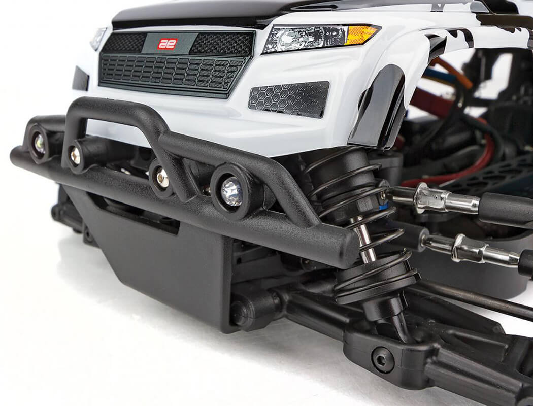 Additional features include full metal diff ring and pinion gears, three sealed differentials, aluminum steering rack, lightweight aluminum center driveshaft, and durable, impact-absorbing front bumper with LEDs. With the Reflex 14MT RTR you can now have big performance in a small scale Ready-To-Run package!