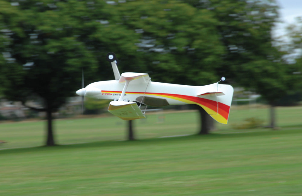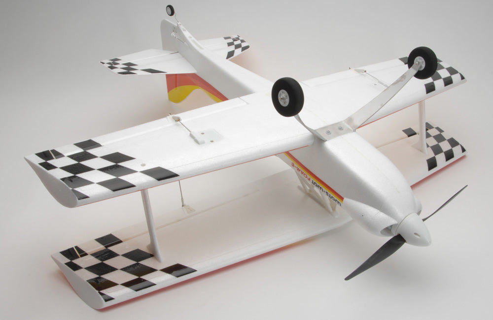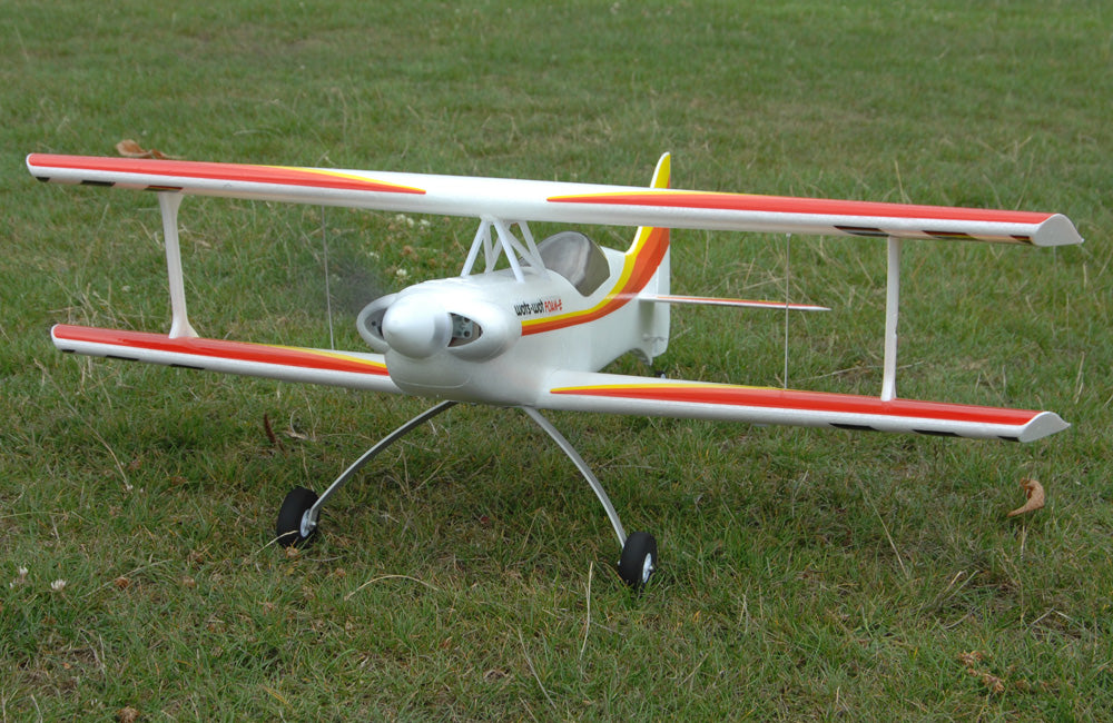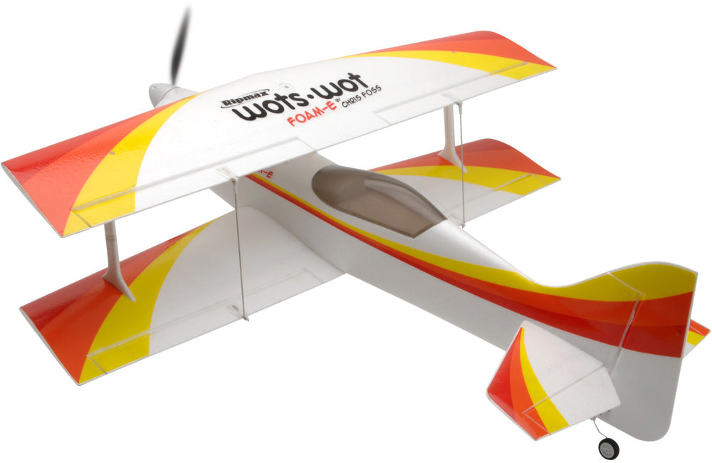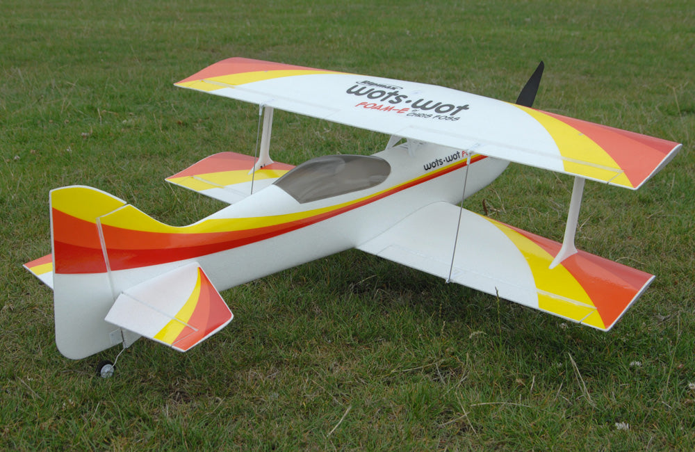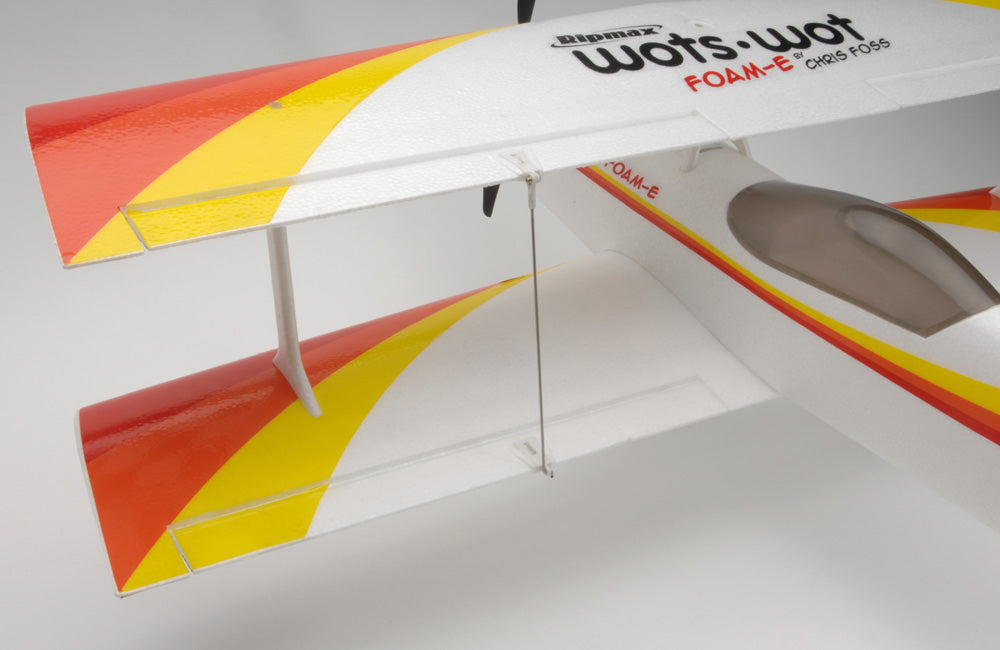 In the air biplanes are associated with slow scale flight but not the WotsWot, thanks to four large ailerons the roll rate is fast and authoritive and the short moment of the design gives great elevator and rudder power. The Wots Wot really excels during slow speed flight and can be really docile with low rates on. Up the rates and open the throttle for flicks, spins and knife edge loops are more! The stall is benign and thanks to the biplane configuration it really slows down nicely for landing.