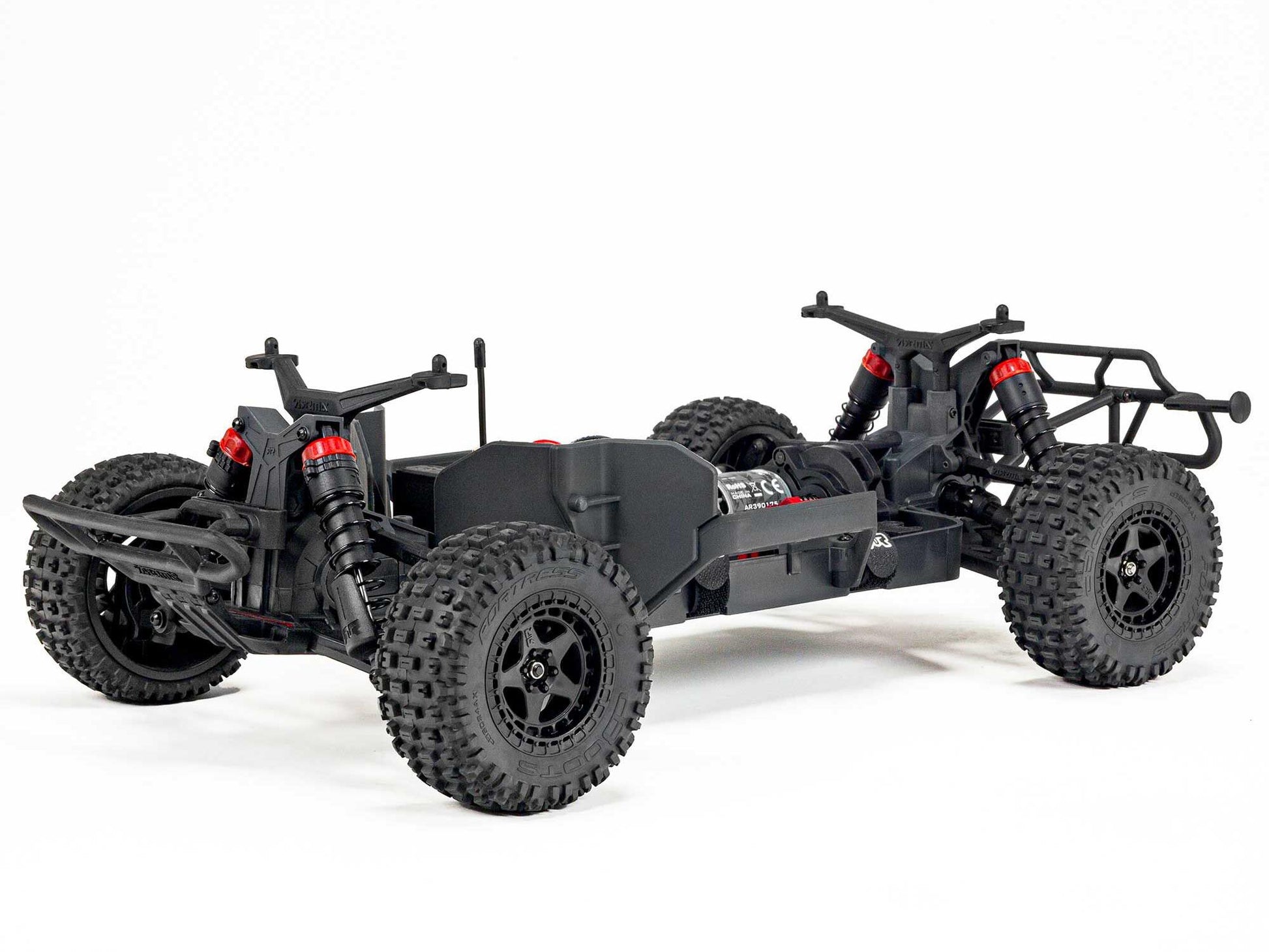 The self-bleeding, oil-filled shocks with silicone O-rings use a tried and tested, coil-over design for effortless maintenance and amazing handling. Their innovative rod-end has a moulded-in spring perch for extra toughness. High chassis guards limit the amount of dirt and debris that can get into the chassis tub. Shock-absorbing loops keep the front and rear bumpers secured to the chassis, offering defense against heavy impacts.