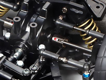 _Reversible Suspension Arms _CVA Oil Shocks _FRP Front & Rear Damper Stays (newly-designed) _Metal Suspension Mounts (w/3°rear toe-in) _Metal Wheel Axles, Gearbox Joints & Drive Shafts _Full Ball Bearings _Turnbuckle Upper Arms & Steering Linkage _Die-Cast Metal Hex Wheel Hubs