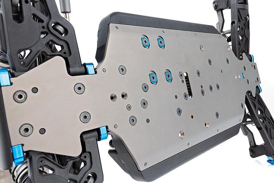 - New 7075 aluminum hard anodized chassis features updates to strengthen the front and rear droop tab areas and an increased width along kick up area