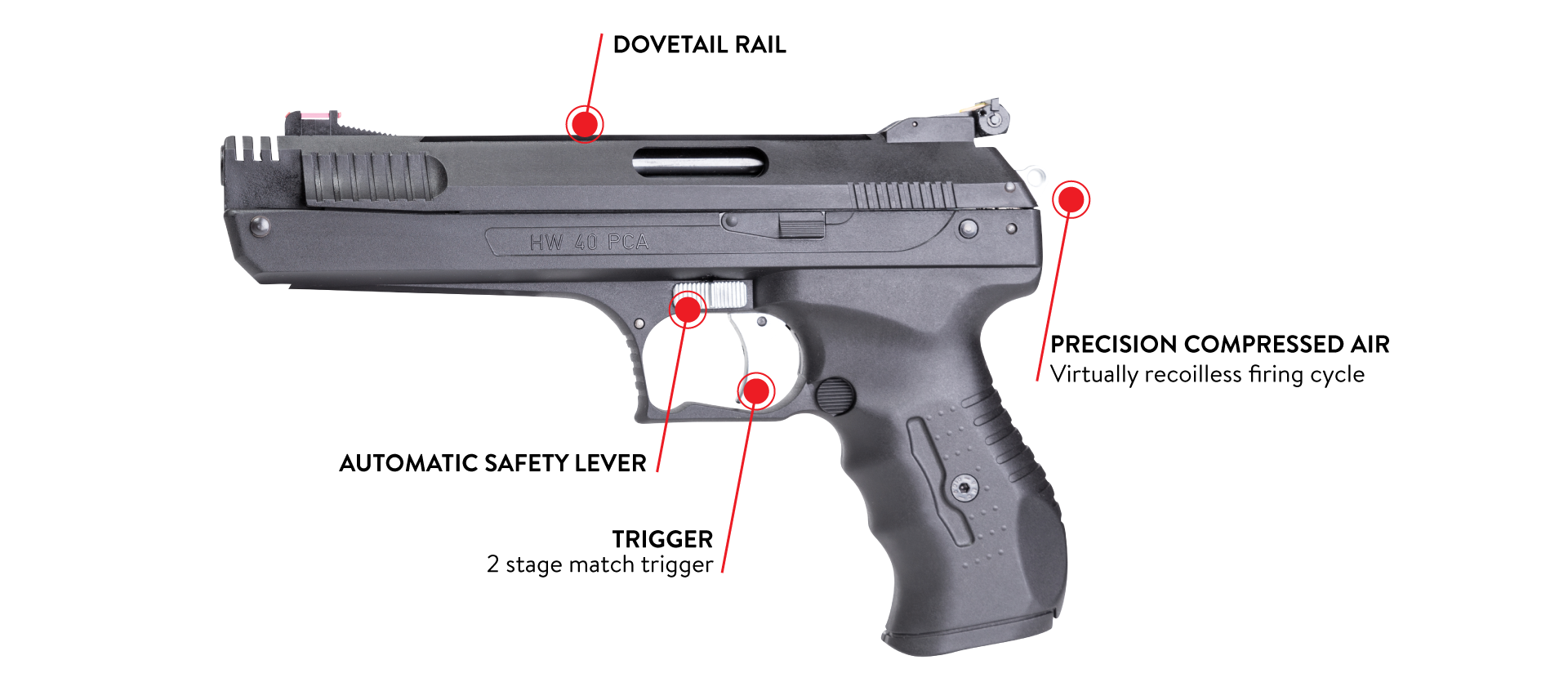 PCA stands for ‘precision compressed air pistol’ that offers virtually a recoilless firing cycle. This single-stroke pneumatic pistol is competitively priced yet offers Weihrauch quality. You are guaranteed smooth shots, quiet noise levels, well-balanced handling and it features Weihrauch’s two-stage match trigger. The pistol also features fibre-optic enhanced sights, a dovetail rail for scope use and automatic safety lever.